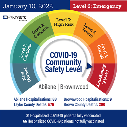 Effective immediately, Hendrick Health’s COVID-19 Community Safety Dial is Level 6: Emergency. The dial level increase is in response to the rapid ...